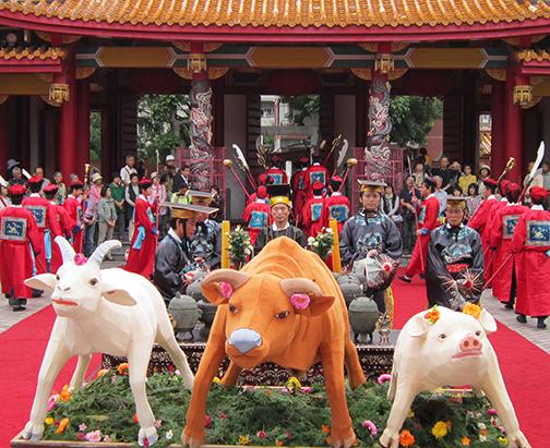 孔子祭(釈奠せきてん)では、孔子廟内の大成殿前方に三牲(牛、豚、山羊各一頭)が供えられ、孔子の誕生日を祝います。