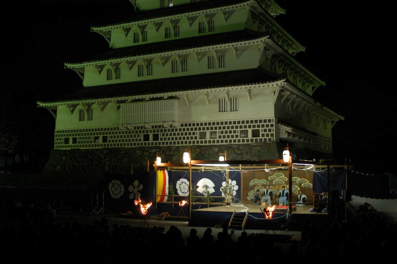 島原城を背景に篝火の明かりの中で能が舞われ、幻想的な光景が広がる