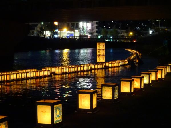 原爆死没者を追悼慰霊。地元小学校、自治会等で万灯作製。川面に井形に組み、船で曳航します。