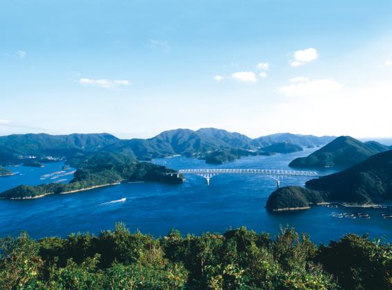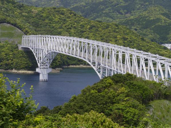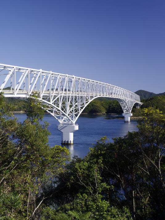 西海国立公園・若松瀬戸に架かる全長522mのトラス橋。橋の中央から見下ろすと、渦を巻く潮の流れや入り江の鮮やかな海の色を楽しめます。橋の下を大小さまざまな船が行き交う光景は、ここでしか見られない特別な眺めです。龍観山展望所など周辺のさまざまな場所から橋の姿を眺めることができます。