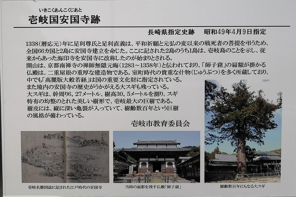 1338年(暦応元)足利尊氏とその弟の直義は、平和祈願のため、全国六十六ヶ国と二島に安国寺建立を命じました。壱岐では従来あった海印寺を安国寺と名前をかえ、京都南禅寺の禅師無隠元晦が開山した臨済宗のお寺です。「師子窟」の扁額の掛かる仏殿は、二重屋根の重厚な建築物。