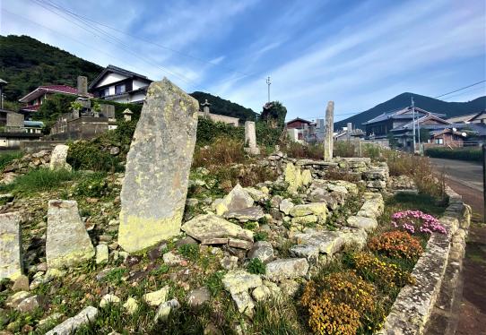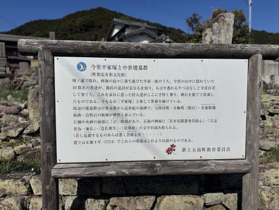 平家一族の一部は壇ノ浦の戦いで負けた後、西の島々に逃げました。そのうち今里の山に隠れていた10数名は、源氏の追っ手が迫っていることを知りました。もう逃げ場がないと悟った彼らは、全員が命を絶ちました。村人たちは彼らの最期を深く悲しみ、丁寧に葬って供養の碑を建てました。この場所は「平家塚」と呼ばれ、現在も供養が続けられています。