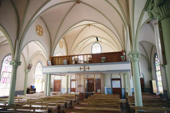 ロマネスク、ゴシック、和風建築が混合した白亜の美しい教会