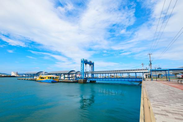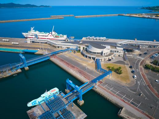 五島市の玄関口でもある福江港ターミナル。長崎港・博多港・奈留島・久賀島・上五島の他、椛島・赤島・黄島と海路で結ばれています。長崎港からはジェットフォイルで約1時間25分、フェリーで約3時間10分。博多港からはフェリーで約8時間30分。詳しくは、各船会社にお問い合わせください。