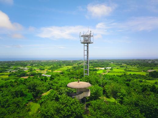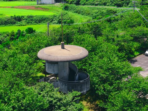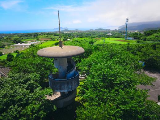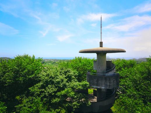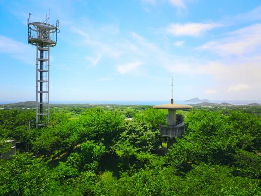 富江半島のほぼ中央付近にある標高84mの只狩山山頂にある展望所。らせん状の三層になっており、鬼岳や富江湾に浮かぶ多郎島・小さな島々など倭寇も眺めたであろう風景を一望できます。山頂付近は、島民や観光客の憩いの場として整備されています。