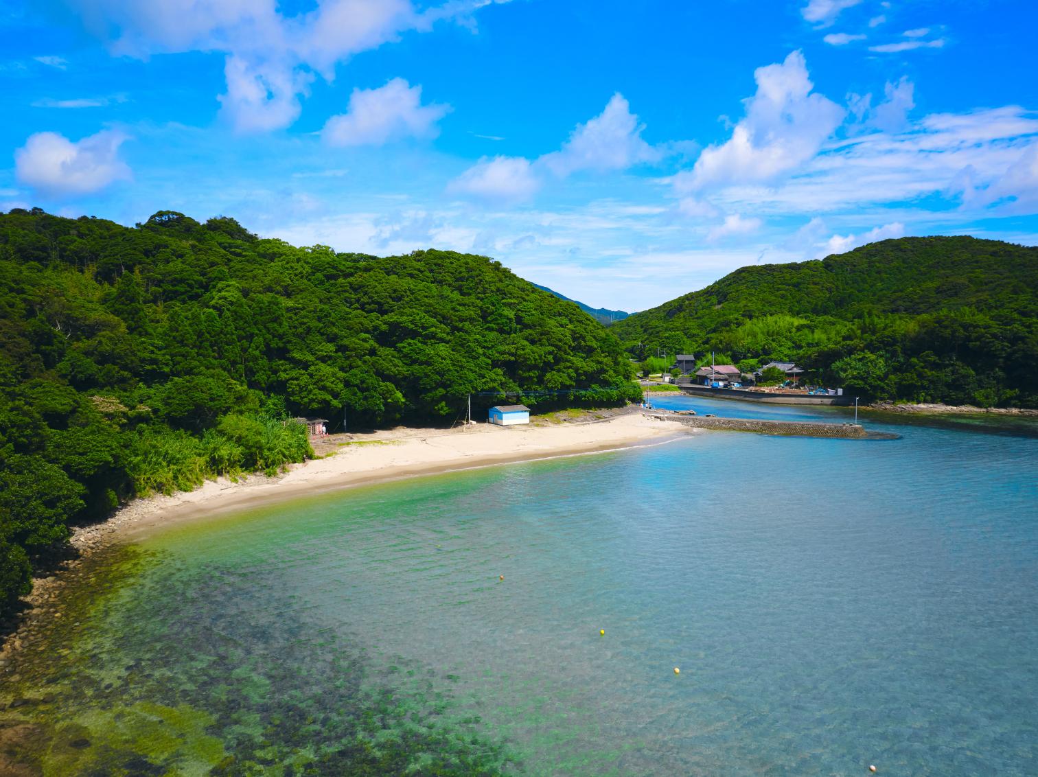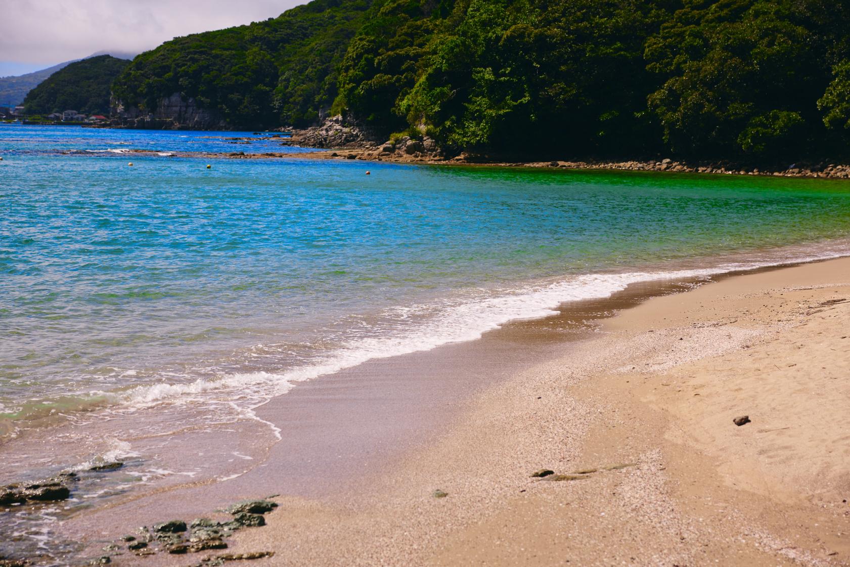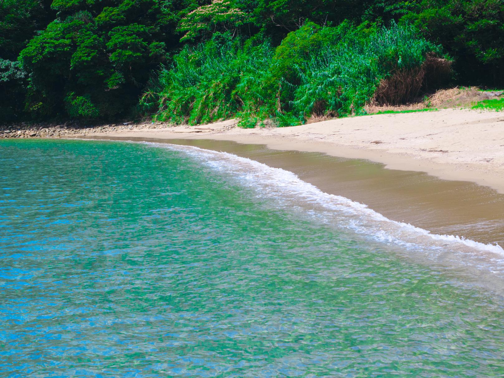 福江港から15分程の場所にあり、市街地から一番近い海水浴場。波静かな入江にあり、まるでプライベートビーチのような小さなビーチです。湾内の水はかなり透き通っていて、小魚が泳いでいるのが見えるくらい透明度は抜群!