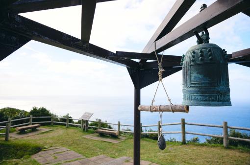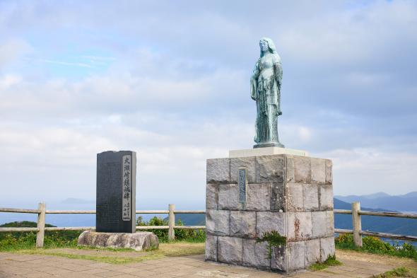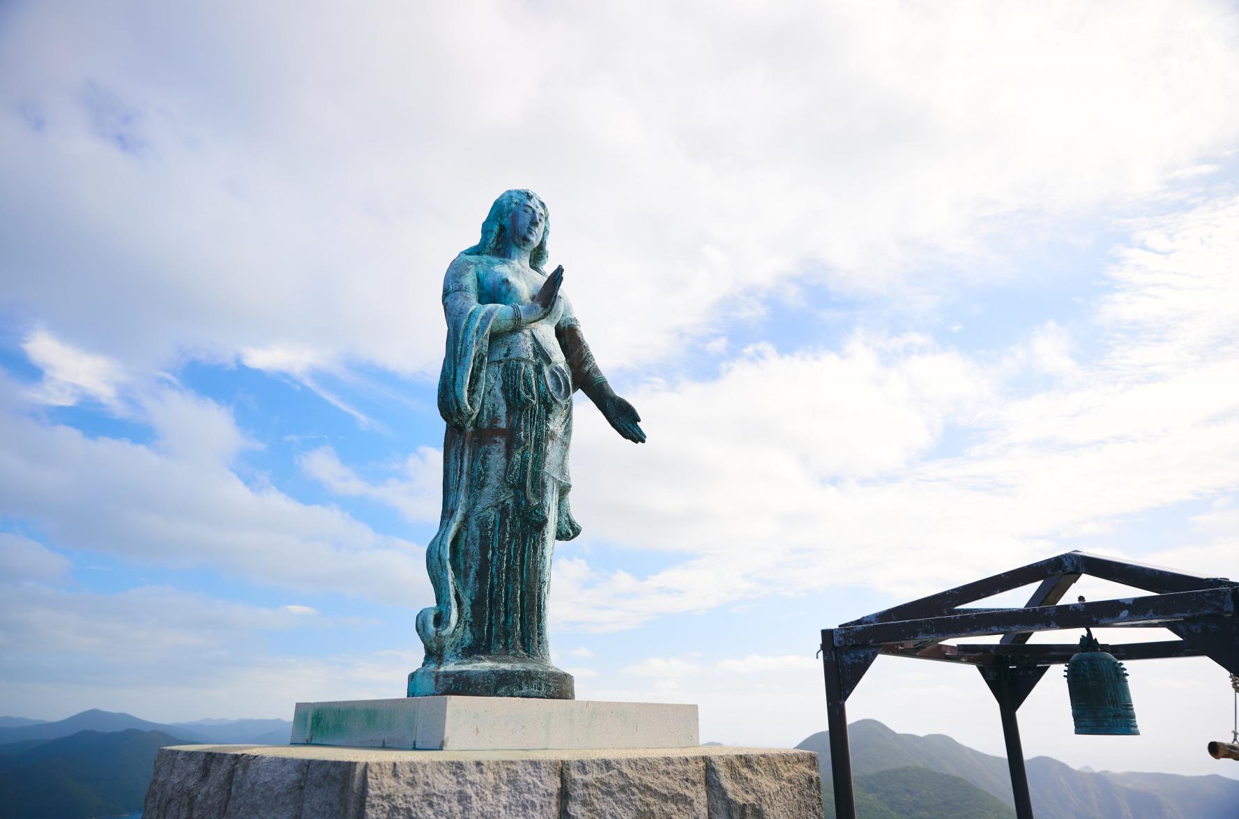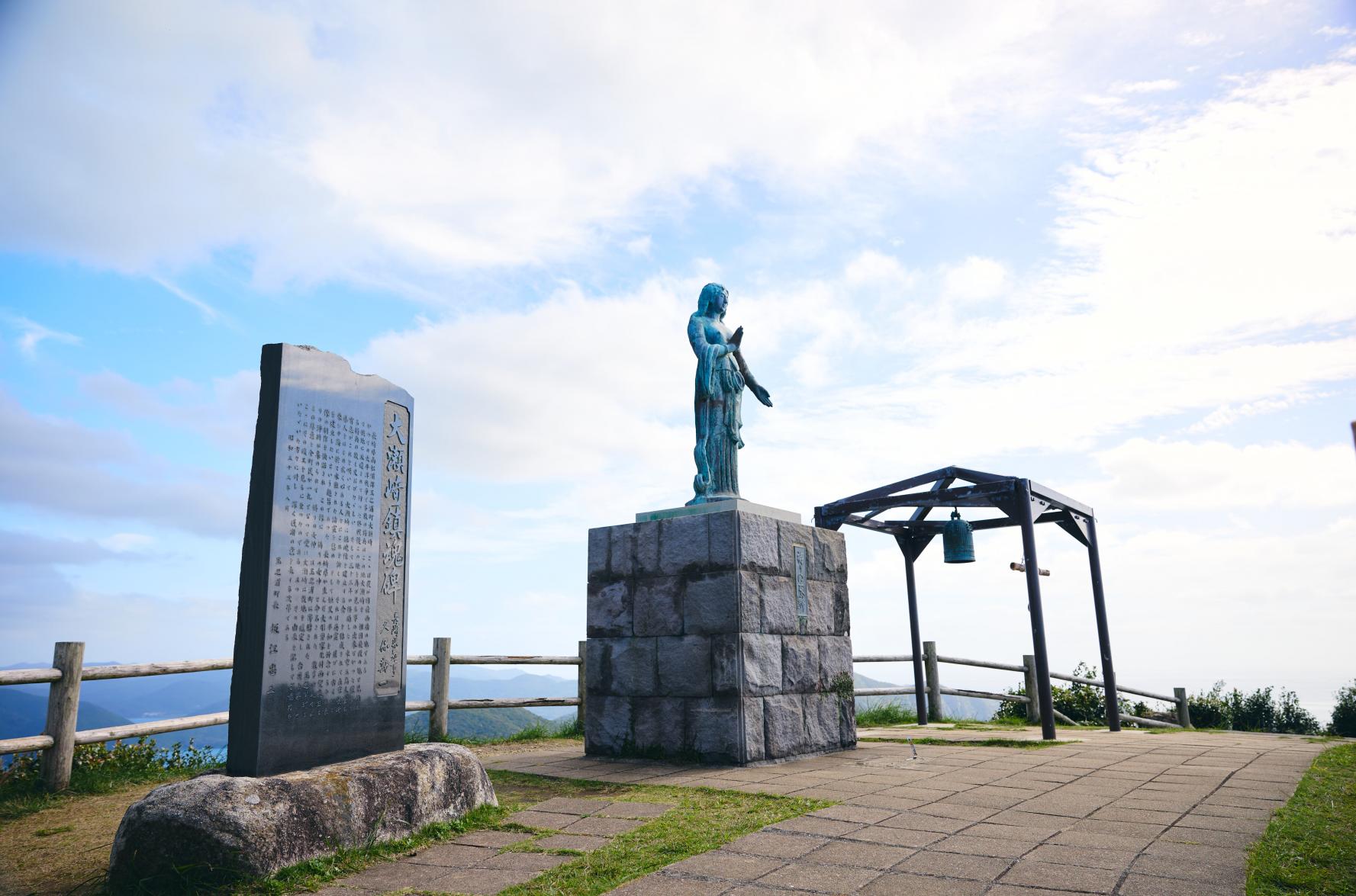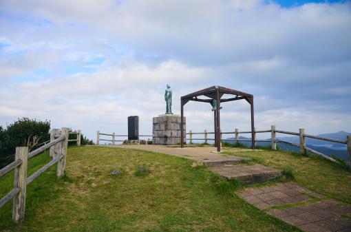 大瀬崎断崖の駐車場から大瀬山への道を登ると、頂上に祈りの女神の像と鐘が建立されています。これは太平洋戦争中、沖を出る船から大瀬崎を見納めの地として南方戦線に赴き、再び祖国の地を踏むことができなかった多くの将兵の霊を慰めるために建立されたものです。