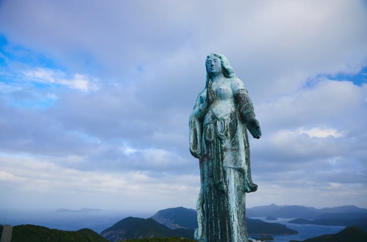 美しい女神の像は、長崎市の平和公園にある平和記念像で知られる北村西望氏作。また、女神の像の横にある鐘は願い事を叶えてくれる鐘として密かに語り継がれています。