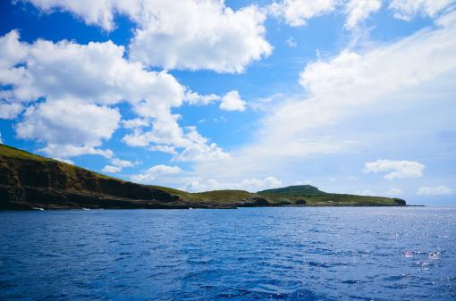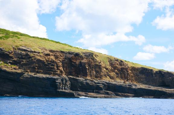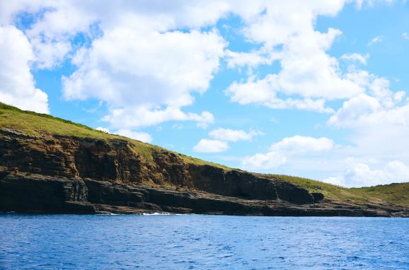 ここ千畳敷は、嵯峨島をつくる2つの山、女岳と男岳の接合部分になります。畳がたくさん敷かれているように見えることからこの名前で呼ばれています。千畳敷では、火山の噴火で降り積もった火山灰などが幾層にも重なり、波や雨、風によって削られることで、この独特の景観を創り出しています。地層の中には、噴火で飛んできた礫(れき)が埋まっている様子や海食洞(かいしょくどう/波の浸食でできた洞窟)も観察できます。