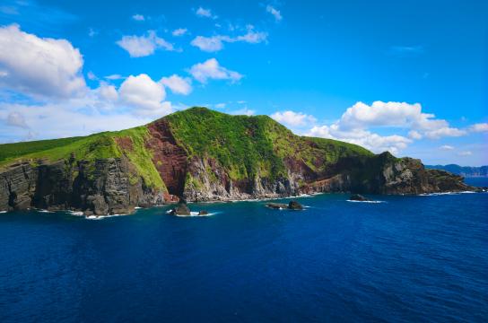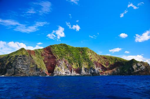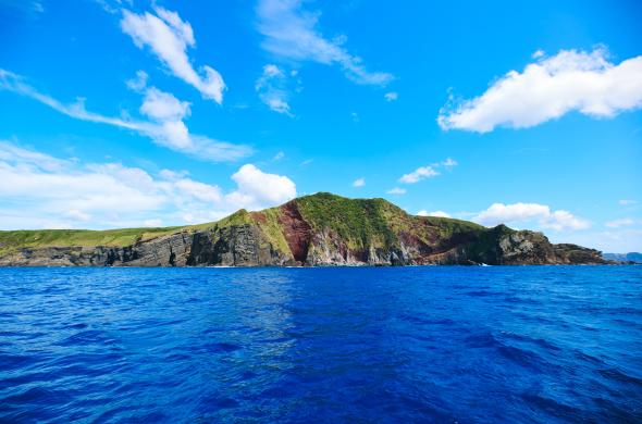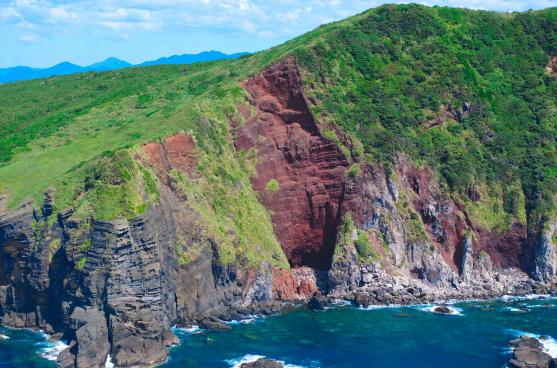 東シナ海の激しい波浪を受ける島の西海岸の侵食は、両火山とも火口付近まで削り取られて垂直に海食崖の絶壁を作っています。そして、爆発した火山のすさまじさや内部構造、放出物を貫く岩頸岩脈などが色鮮やかで、まるで火山の模型を見るようです。この海食崖は、学術的にも世界でも珍しい貴重な地学的資料といえます。