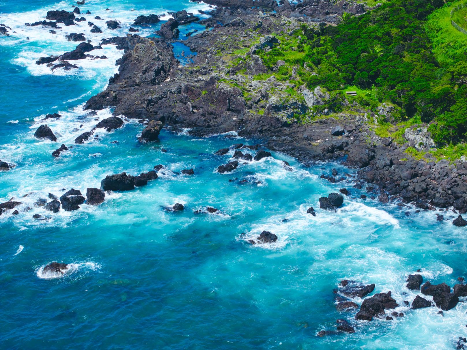 黒くゴツゴツし複雑に入り組んだ鐙瀬溶岩海岸は、かつて約5万年前に鬼岳付近の火山の噴火で流れ出た溶岩で付近の大地が形成され、その後の海面上昇で今の海岸景観になりました。