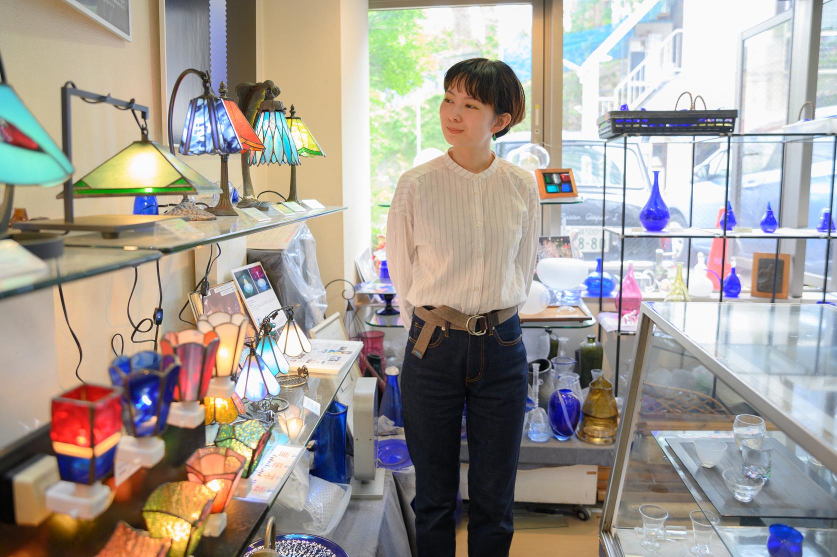 工房では、現代の「びいどろ吹き」である職人さんが、丹精込めてガラスに新しい命を吹き込み、日々創作に励んでいます。工房内には様々な色や形の美しいガラス製品がずらり。瑠璃庵の職人さんは、なんと国宝・大浦天主堂のステンドグラス修復工事を手がけた他、公共施設などのステンドグラス制作もされています。